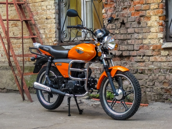 Комплектация Барабанные тормоза. Цепь прикрыта защитным кожухом. Багажник из металлических труб. Зеркала заднего вида.