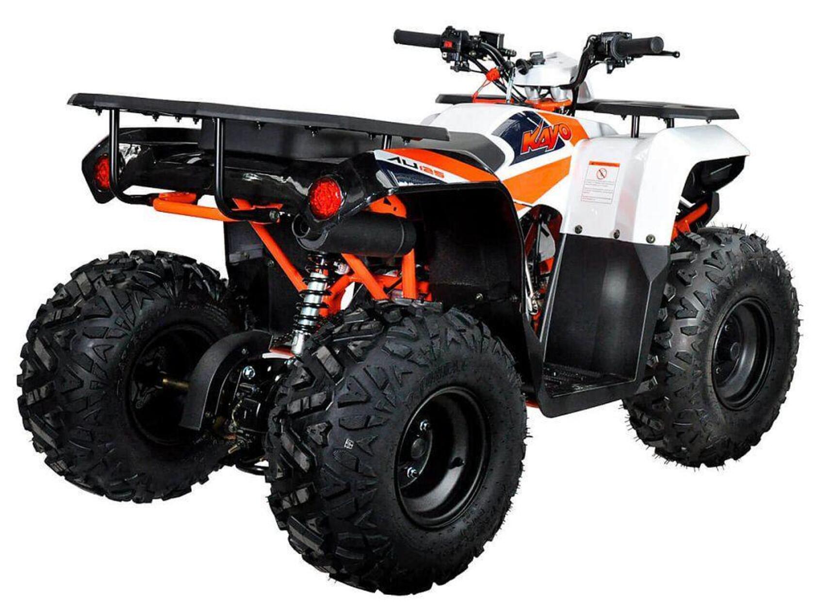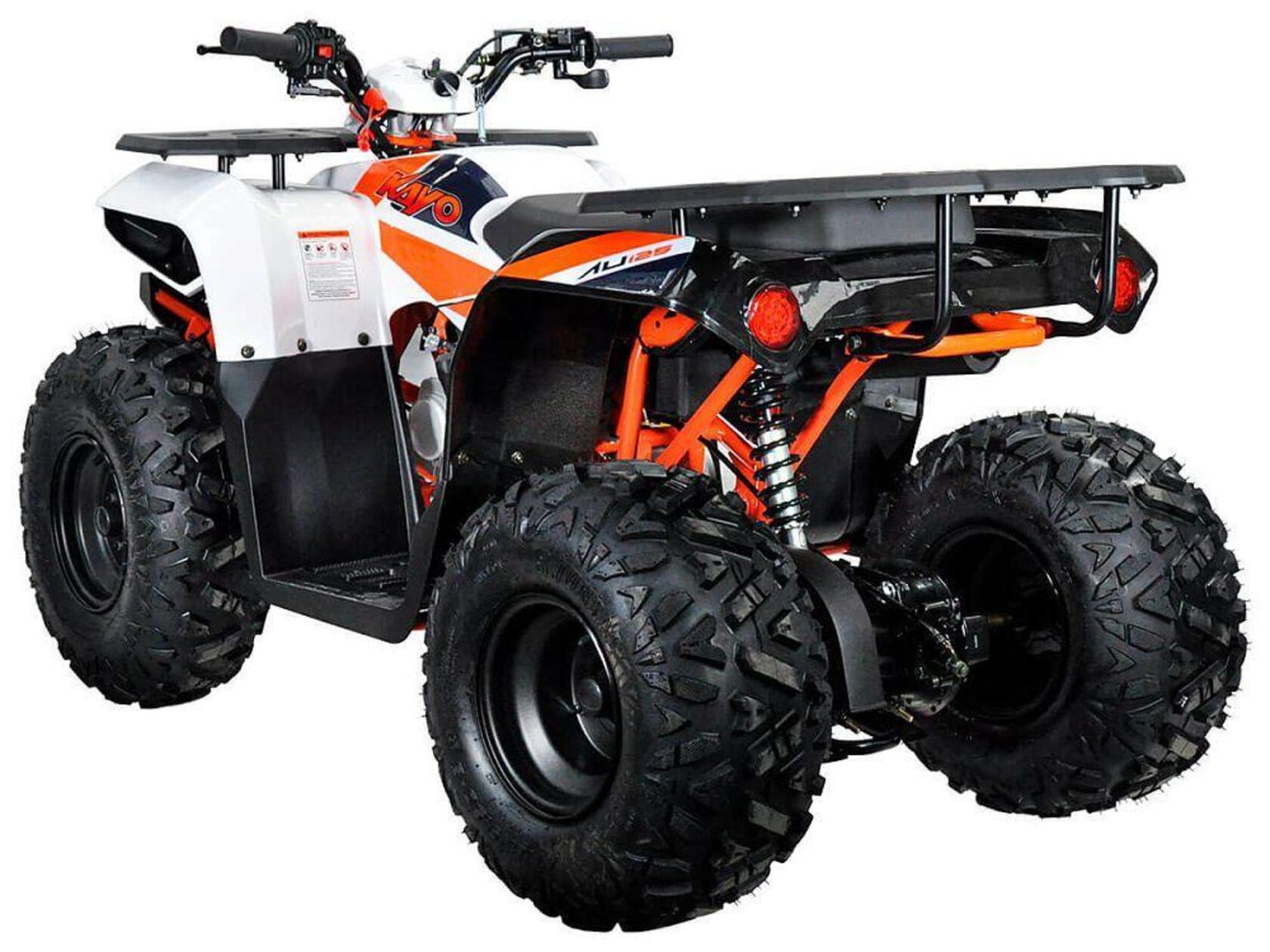 KAYO AU125 – утилитарный квадроцикл, особенно популярный среди юных любителей внедорожных приключений возрастом от 10-12 лет и старше. Обновленную модель отличают простота и удобство управления, а также широкие возможности повседневного использования..Модель оснащается проверенным экономичным 4-тактным двигателем воздушного охлаждения рабочим объемом 120 см3 и полуавтоматической трансмиссией с возможностью переключения в реверсный режим хода. Возможности силовой установки позволяют развивать максимальную мощность в почти 8 лошадиных сил..Квадроцикл собран на прочной раме из стальных труб; подвеска представлена нерегулируемыми амортизаторами, обеспечивающими комфорт передвижения в самых разных условиях. Колеса собраны на стальных 8-дюймовых дисках; за безопасность отвечает производительная дисковая гидравлика. Дополнительный комфорт использования обеспечивают комплект светового оборудования, передний и задний багажники..Надежный и компактный мотовездеход KAYO AU125 станет надежным спутником в поездках по пересеченной местности в любое время года, а также может выступить в роли незаменимого помощника в подсобном хозяйстве загородного дома или дачи.