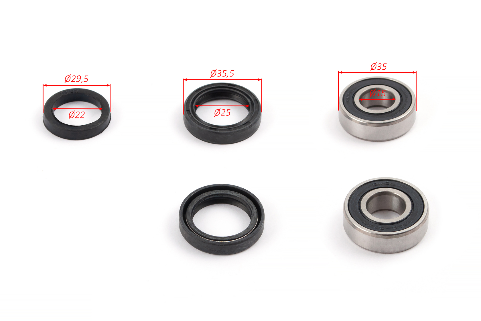 Готовый комплект для обслуживания и ремонта ступицы переднего колеса. Включает подшипники, маслосъёмные сальники и втулку для быстрой и простой замены всех изнашиваемых деталей, что важно для поддержания плавности хода и надёжности управляемости.